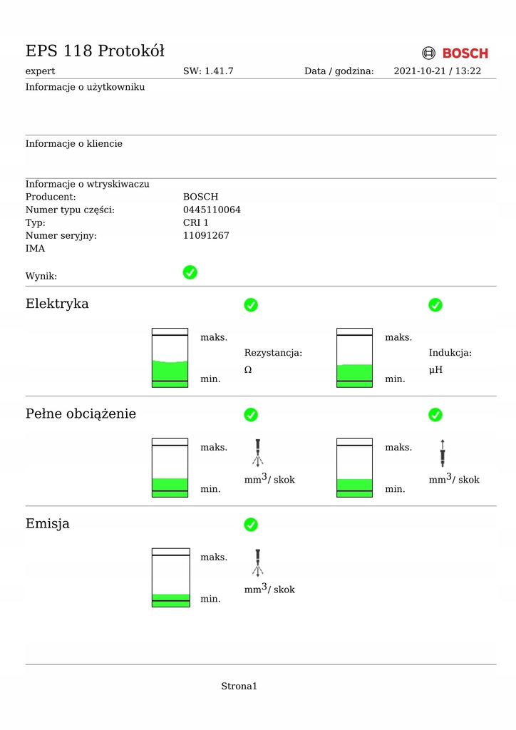 Descrição: BOSCH 0445110064, testado no aparelho BOSCH EPS118, resultado do teste na foto (I, FL, 2.0CRDi, 16V, 83kW, 113KM, ABS, climatização, minivan 5d, código do motor D4EA, código de cores EB) - A && 2.0CRDi qualidade INJECTOR 0445110064 TESTADO